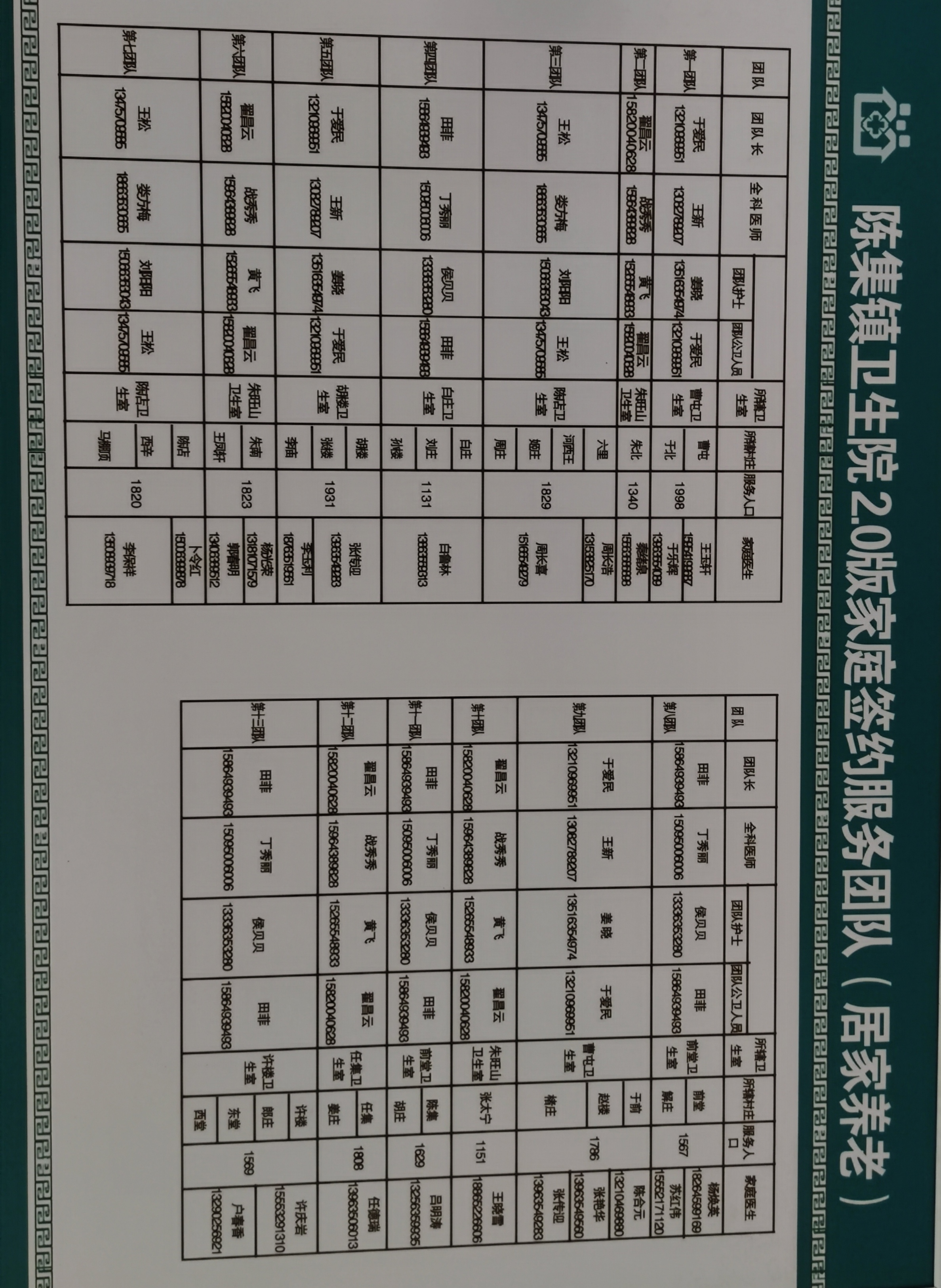 | 服务团队 | 服务村人口 | 家庭医生 | 团队护士 | 公共卫生 | 乡村医生 | 服务村庄 | 联系电话 | ||