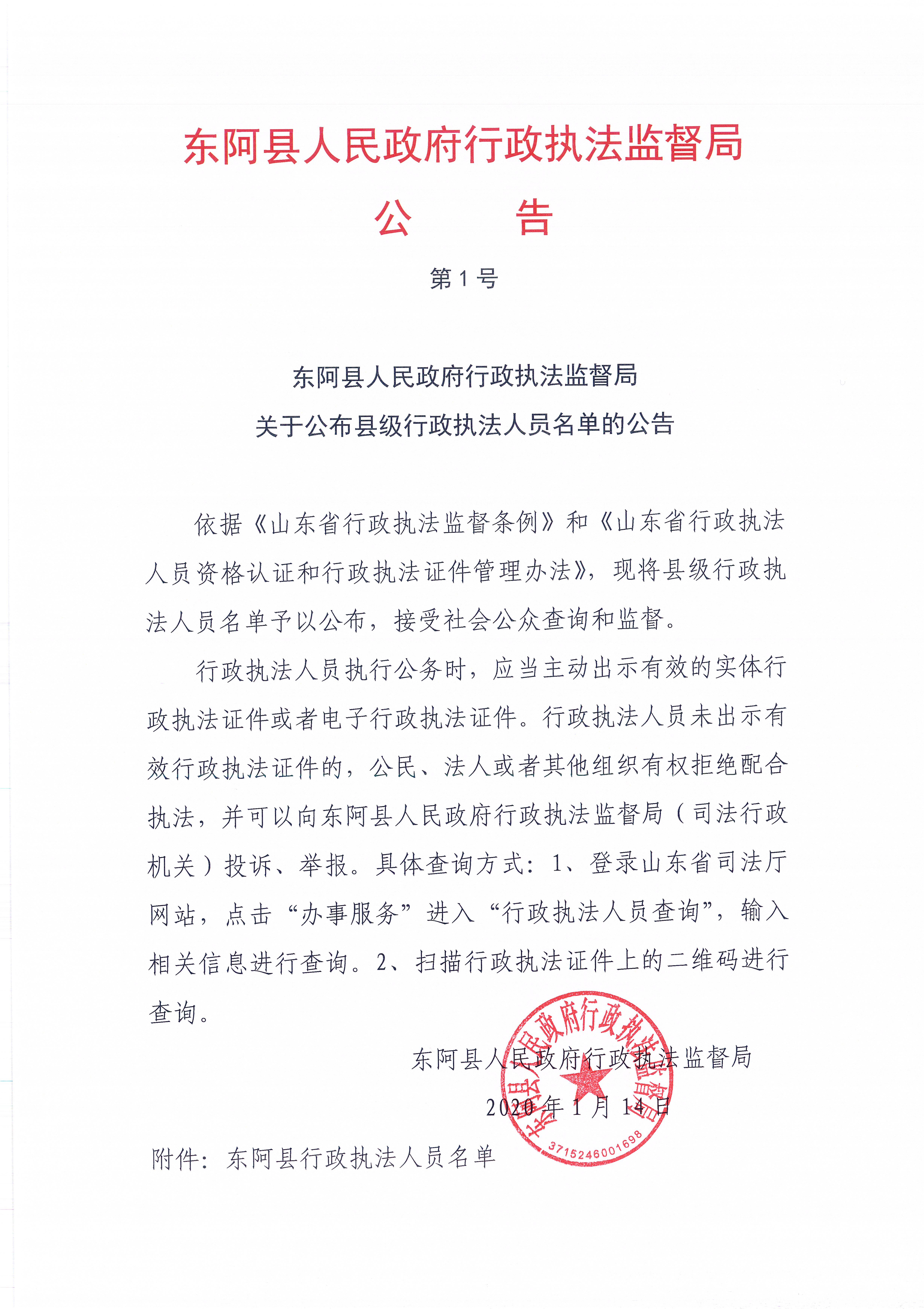 东阿县人民政府行政执法监督局关于公布县级行政执法人员名单的公告