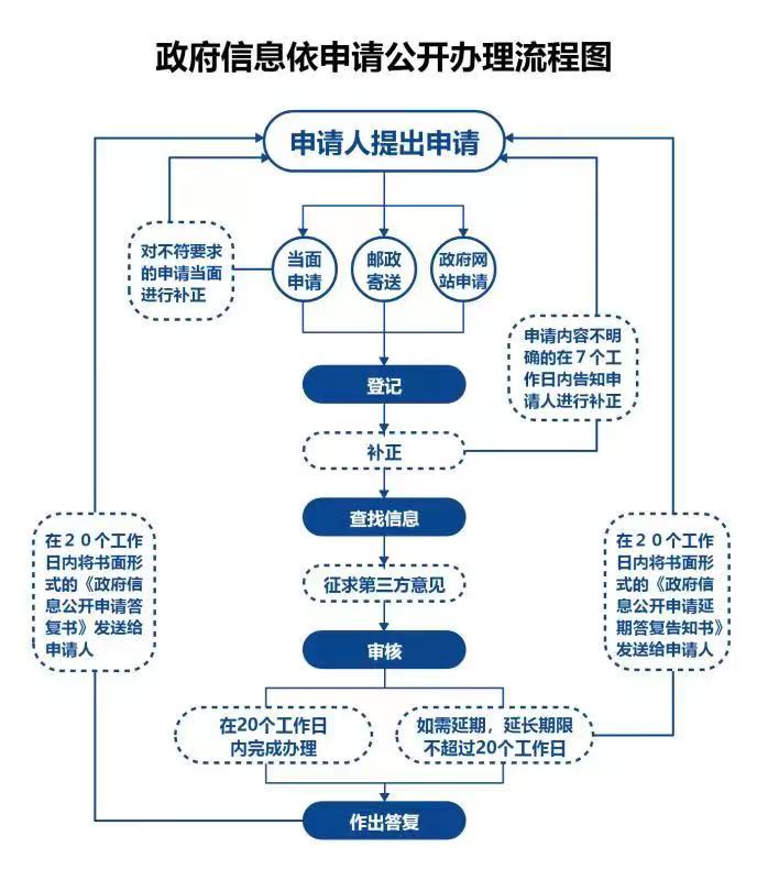 2.办理期限:行政机关收到政府信息公开申请,能够当场答复的,应当当场予以答复。行政机关不能当场答复的,应当自收到申请之日起20个工作日内予以答复;如需延长答复期限的,应当经本行政机关政府信息公开工作机构负责人同意,并书面告知申请人,延长答复的期限最长不得超过20个工作日。